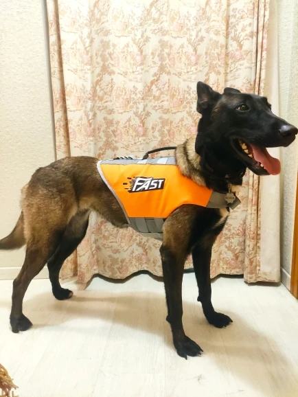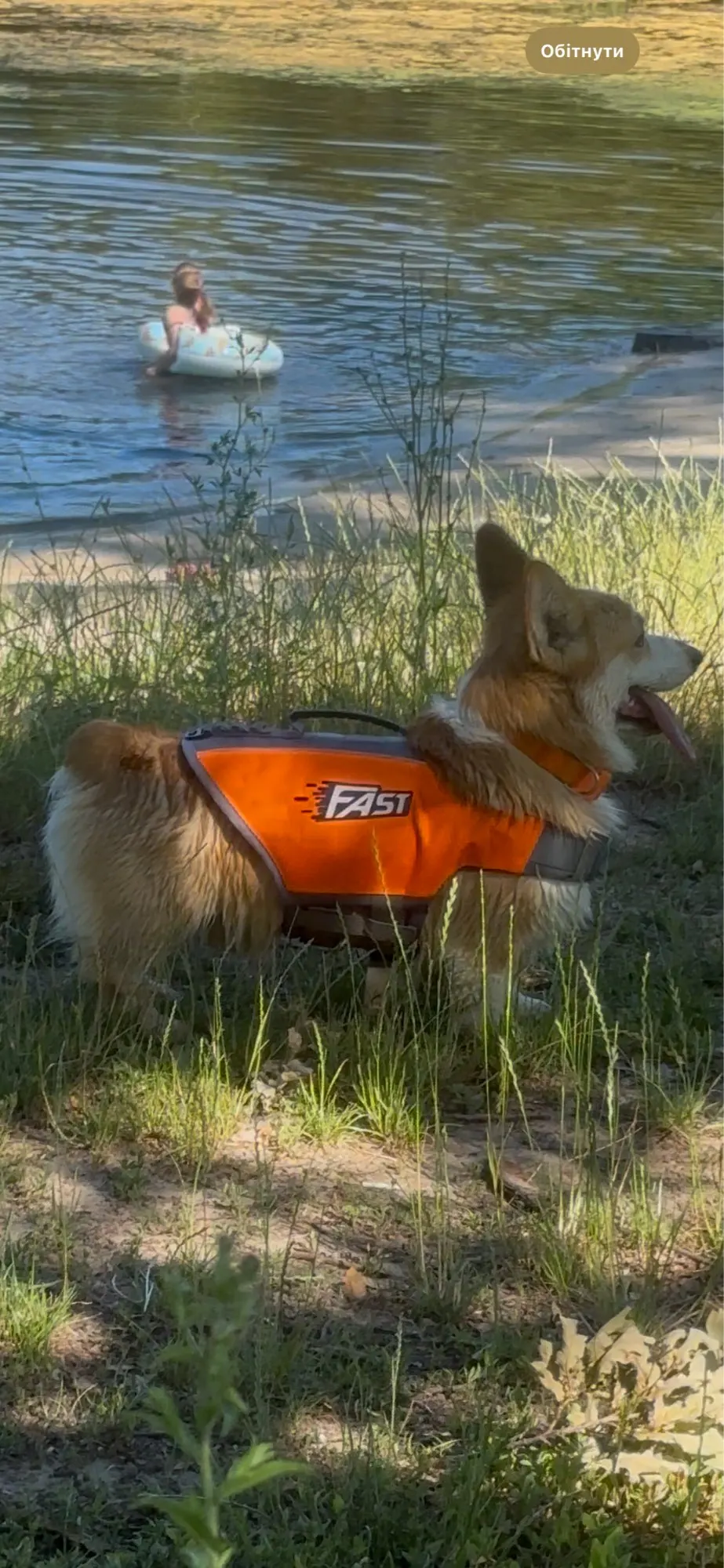 We took size M. It fits perfectly for a 14kg corgi. Supports on water. And the dog does not drown. The color is bright and visible from a distance; there is a handle at the top for quick retrieval from water. Very comfortable and adjustable with Velcro and snaps